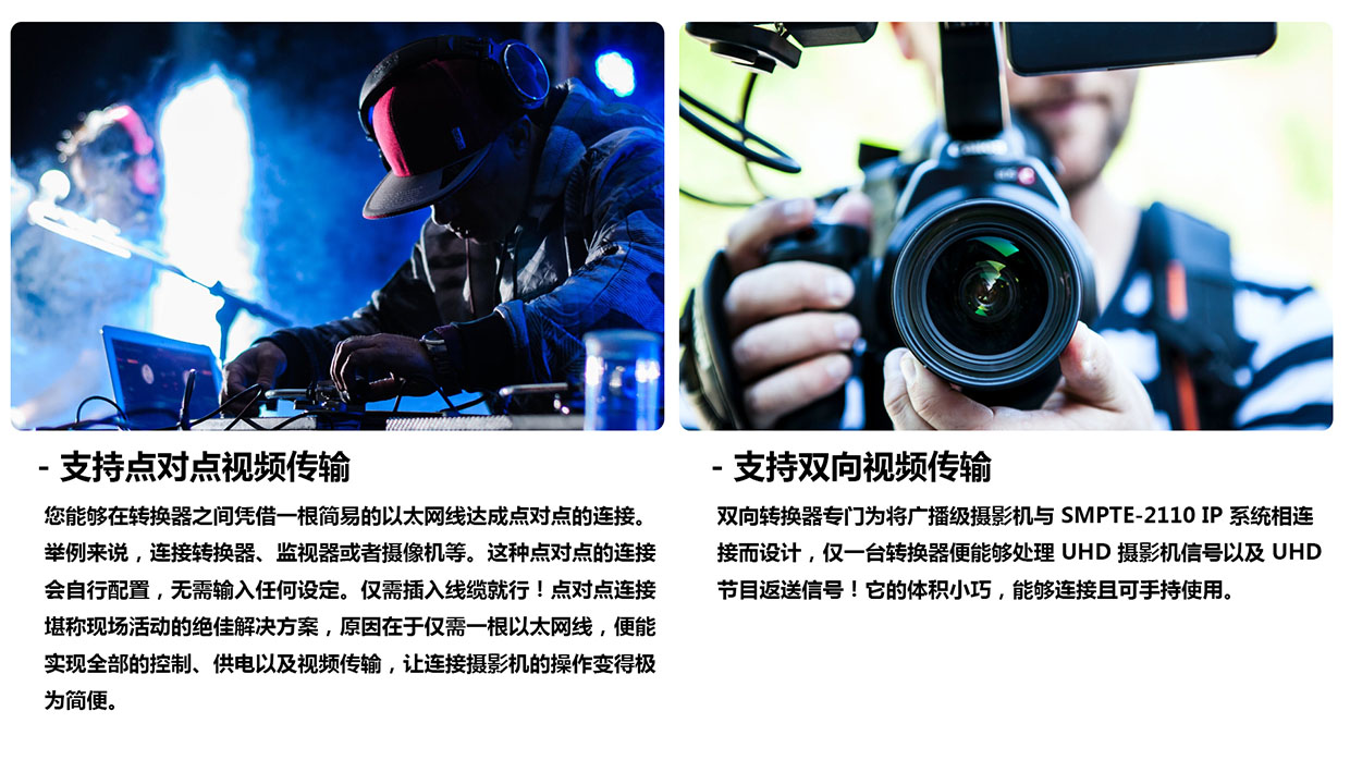 安装极为简单,解决繁琐布线的难题。因为它们能够进行点对点连接,如果您不想使用复杂的以太网交换机,完全可以不用。也就是说,您不但能够获取 SMPTE - 2110 IP 视频的优势,还能拥有简便的以太网连接、远程供电以及双向视频,这与 SDI 工作流程毫无差异。在将摄影机连接转换器之后,通过一根线缆就能实现摄影机控制、节目视频、供电和 Tally。