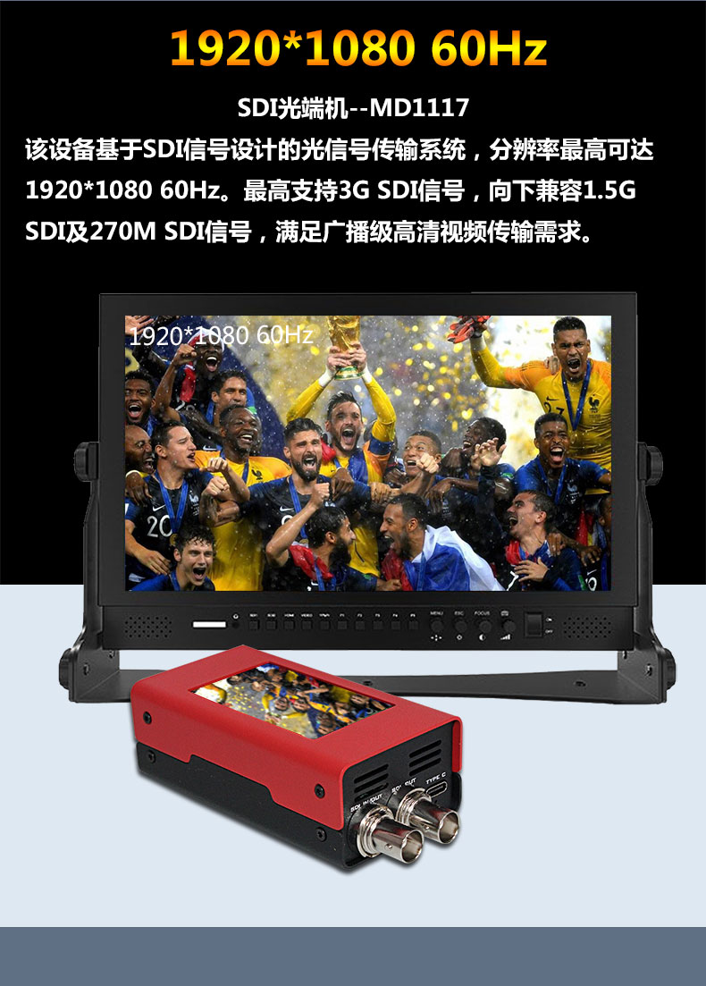 SDI光端机--MD1117 该设备基于SDI信号设计的光信号传输系统,分辨率最高可达1920*1080 60Hz。最高支持3G SDI信号,向下兼容1.5G SDI及270M SDI信号,满足广播级高清视频传输需求。