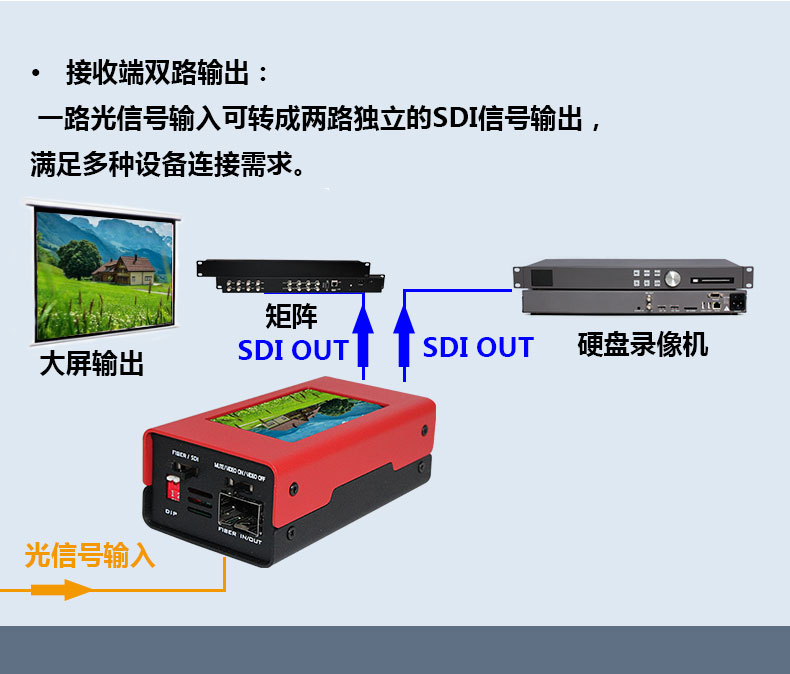 接收端双路输出: 一路光信号输入可转成两路独立的SDI信号输出, 满足多种设备连接需求。