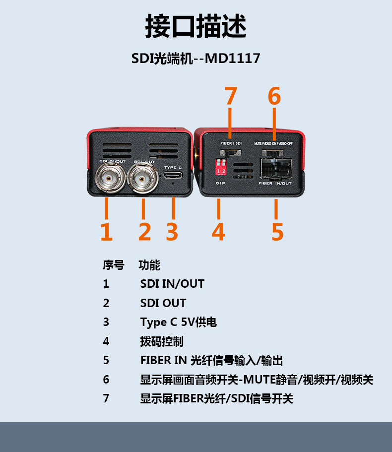 中帝威(DeviceWell)高清视频光端机MD1117,自带2.6寸高清监视屏,是一款专用的SDI 视频光纤传输设备。该设备集成SDI 接收及光信号编码器,可将SDI 信号转换成光信号,采用可拆卸的SFP光模块,根据不同需求可以任意更换不同距离及不同速度的相应模块。MD1117内置信号均衡,串行时钟恢复及线路驱动。设备成对使用,操控拨码开关,就可以自定义光纤和SDI的输入输出。接收端支持1路光信号输入转成2路独立的SDI信号输出。发射端支持一路SDI信号输入,转成一路光纤输出和一路环出。设备对输入信号自动适应,操作简单。可广泛应用于体育赛事、歌舞表演、婚庆和多媒体教学等广播级信号的远距离光纤传输及应用。 设备采用Type C 5V供电系统,可适用于USB设备供电系统。