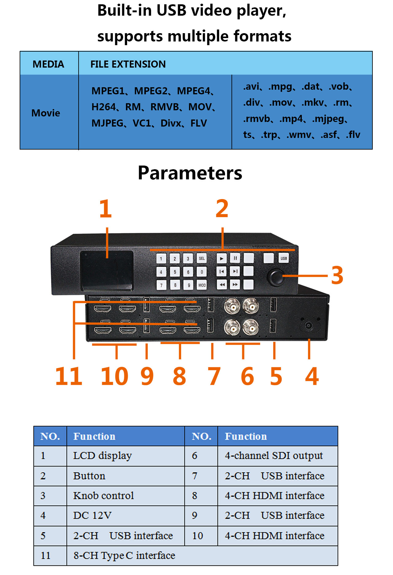 Each USB port offers independent playback, with options for different resolutions and program sources.