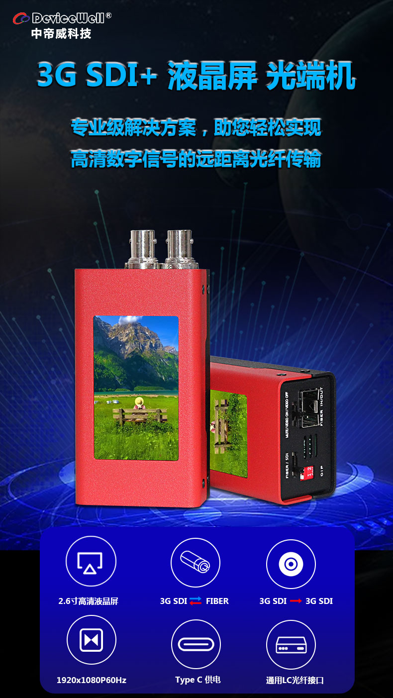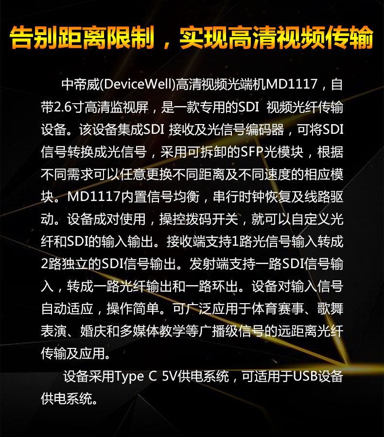 中帝威(DeviceWell)高清视频光端机MD1117,自带2.6寸高清监视屏,是一款专用的SDI 视频光纤传输设备。该设备集成SDI 接收及光信号编码器,可将SDI 信号转换成光信号,采用可拆卸的SFP光模块,根据不同需求可以任意更换不同距离及不同速度的相应模块。MD1117内置信号均衡,串行时钟恢复及线路驱动。设备成对使用,操控拨码开关,就可以自定义光纤和SDI的输入输出。接收端支持1路光信号输入转成2路独立的SDI信号输出。发射端支持一路SDI信号输入,转成一路光纤输出和一路环出。设备对输入信号自动适应,操作简单。可广泛应用于体育赛事、歌舞表演、婚庆和多媒体教学等广播级信号的远距离光纤传输及应用。 设备采用Type C 5V供电系统,可适用于USB设备供电系统。