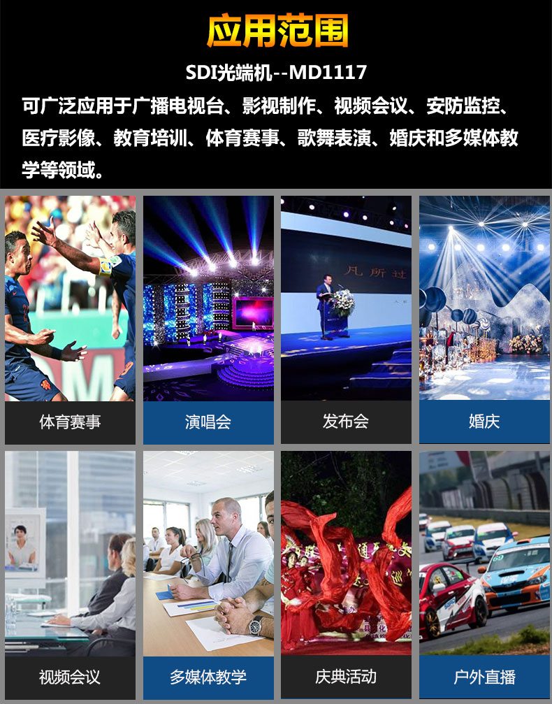SDI光端机--MD1117 可广泛应用于广播电视台、影视制作、视频会议、安防监控、医疗影像、教育培训、体育赛事、歌舞表演、婚庆和多媒体教学等领域。
