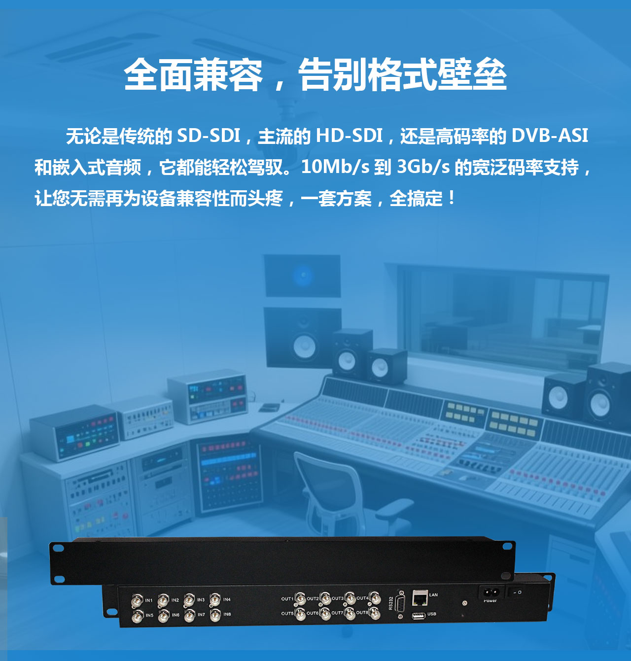 无论是传统的SD-SDI,主流的HD-SDI,还是高码率的DVB-ASI和嵌入式音频,它都能轻松驾驭。10Mb/s到3Gb/s的宽泛码率支持,让您无需再为设备兼容性而头疼,一套方案,全搞定!
