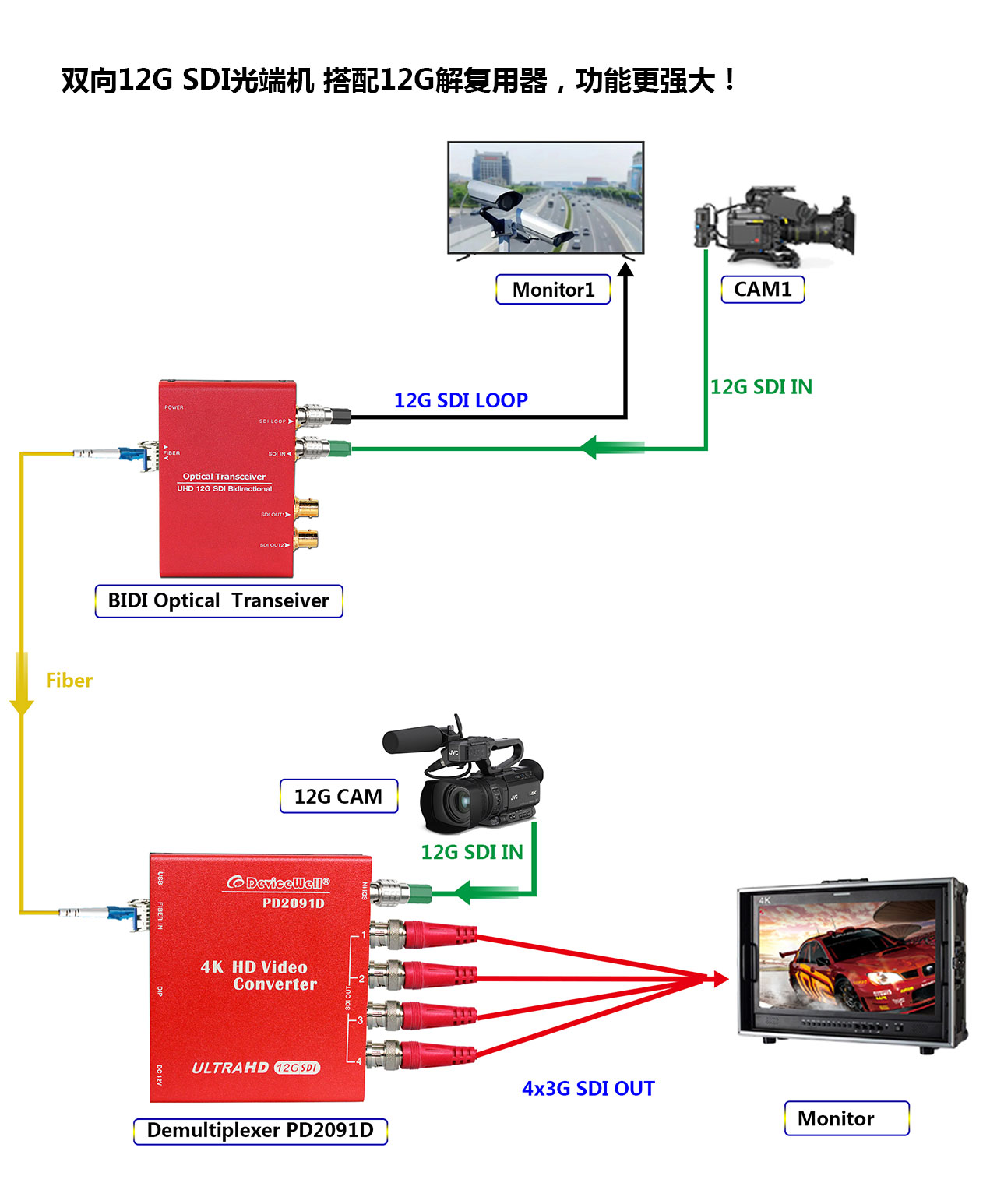 设备成对使用。通过光信号设备同时支持1路12G SDI信号输入,2路独立的12G SDI信号输出,1路12G SDI环出。